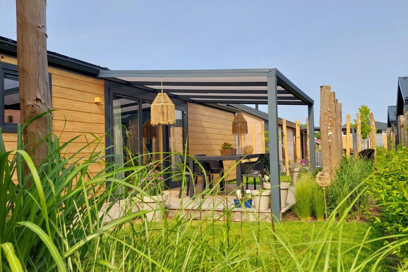 Ervaar comfort en stijl in ons modern eco vakantiehuisje en geniet buiten van veranda en tuin.